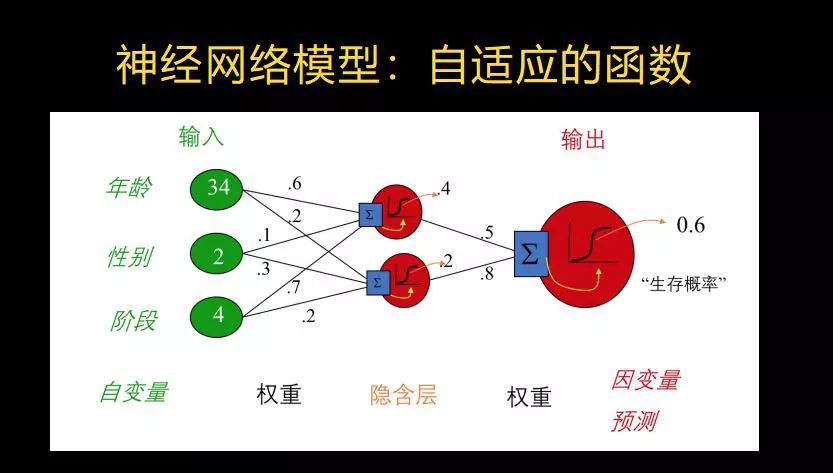 比如这个函数是一个生存概率,它健康还是不健康,这就是一个函数。可以把整个的过程当成一个F,自变量就是X,结果就是Y,但这个F是用了一个多级的组合加权重加域值的方法来定义的F,是一套组合动作,而不只是一个简单的方程,就不是一个简单的线性边界了。
