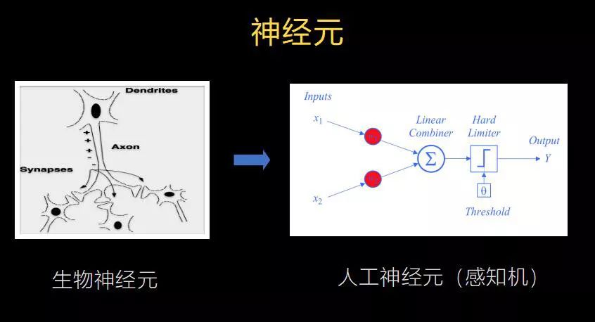 在人的大脑里,有一个元件叫神经元,它是一个细胞,包含了细胞核、突触。经过神经学的研究,发现突触实际上就像导线一样,可以跟其他的神经元产生接触,获得信号。而细胞核实际上是一个激活机制,当信号强度达到一个比较高的水平以后,它的离子开关就被打开了,这样可以产生一个电击的信号。