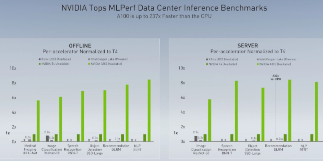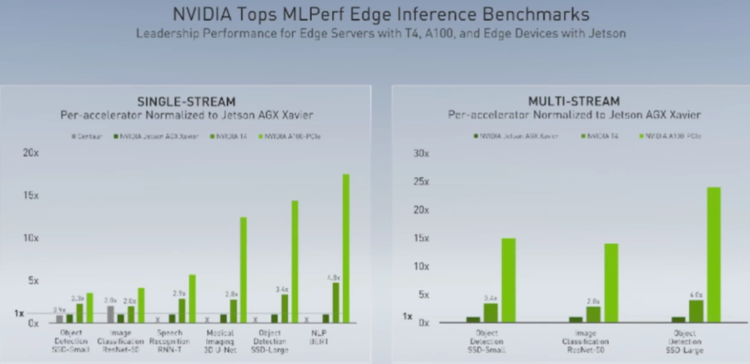 另一张图展示的是边缘推理基准测试,适用于边缘服务器和嵌入式设备。此次A100,T4,以及使用Tegra芯片的Jetson AGX Xavier的性能数字,如图所示,英伟达再次横扫了。