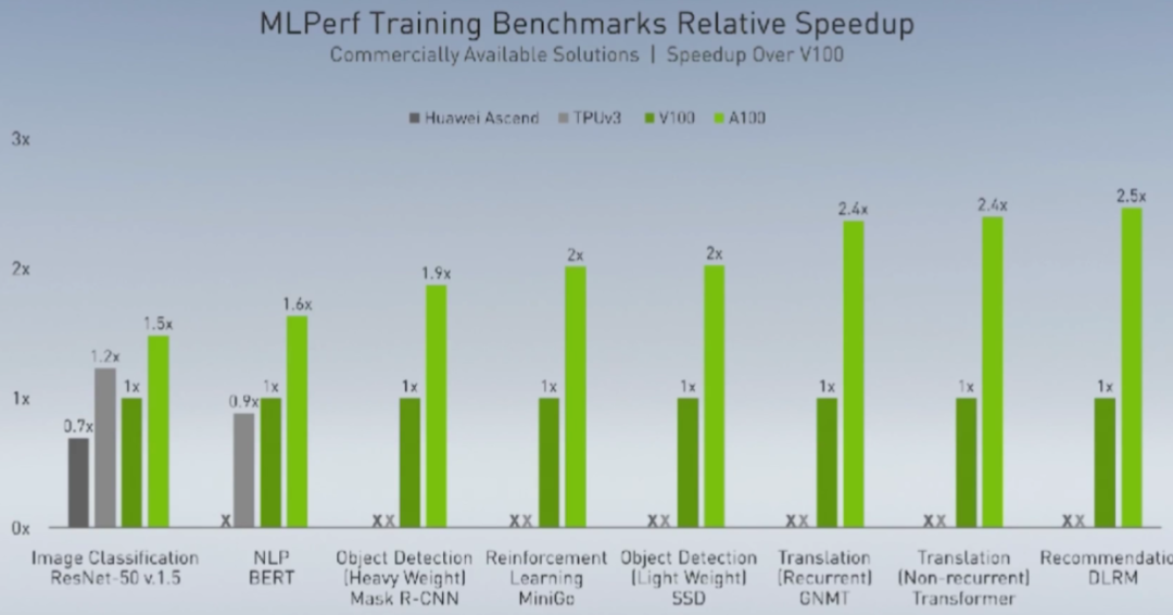 性能方面,Ampere的速度要快2.5倍。相比Google自家的TPU v3和华为,尽管领域不同,但都被Ampere打败。