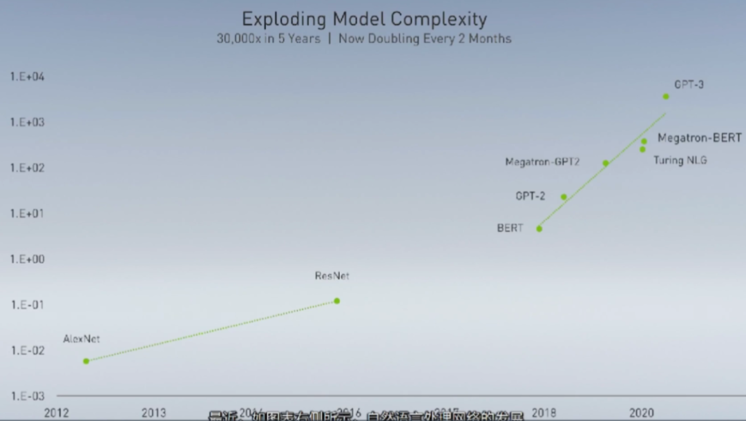 如下表左侧显示,从AlexNet发展到ResNet短短几年时间里,对计算机性能的需求提高到了一个数量级以上。如右侧所示,自然语言处理网络的发展更快,从BERT到GPT-3速度更快,训练时间对Peta级别的算力要求也越来越高。