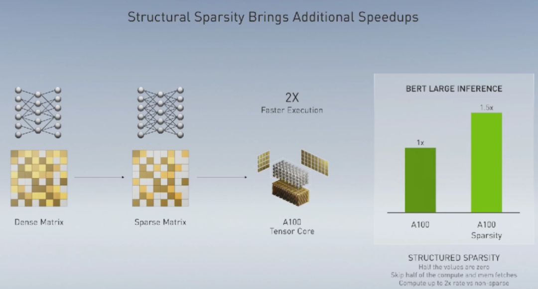 这种压缩的效果是立竿见影的,既然权重设置为0,就无需存储,Ampere通过结构化稀疏性(允许4个权重中的两个为0)来优化了这个问题。对于矩阵乘法,一旦将权重稀疏为2/4模式,就可以实现双倍的性能。