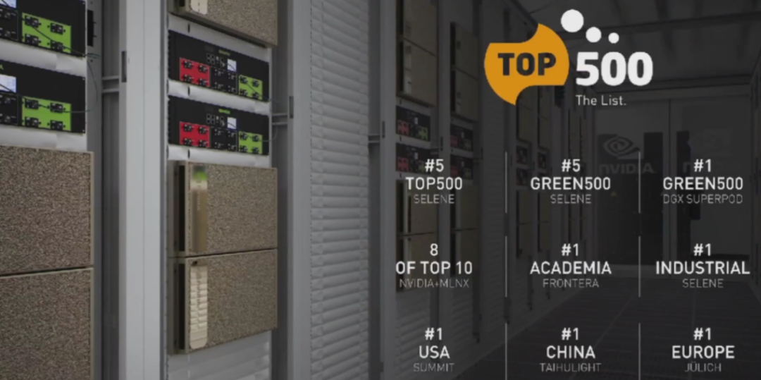 在11月举行的超算TOP500榜单中,采用NVIDIA技术的超算在前10名中占了8位,Selene超算在TOP500和Green500中都排名第五。