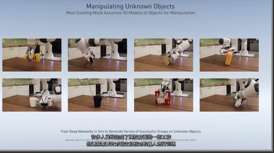 借助深度学习,NVIDIA构建了能够感知环境并与环境交互的机器人。正在开发的一项技术名为「黎曼运动策略」,本质上能够从数学角度简化这一复杂运动问题的表达,便于解决实际问题。在操控方面,除了对机器人抓取特定目标的训练外,还有对陌生目标的抓取训练。