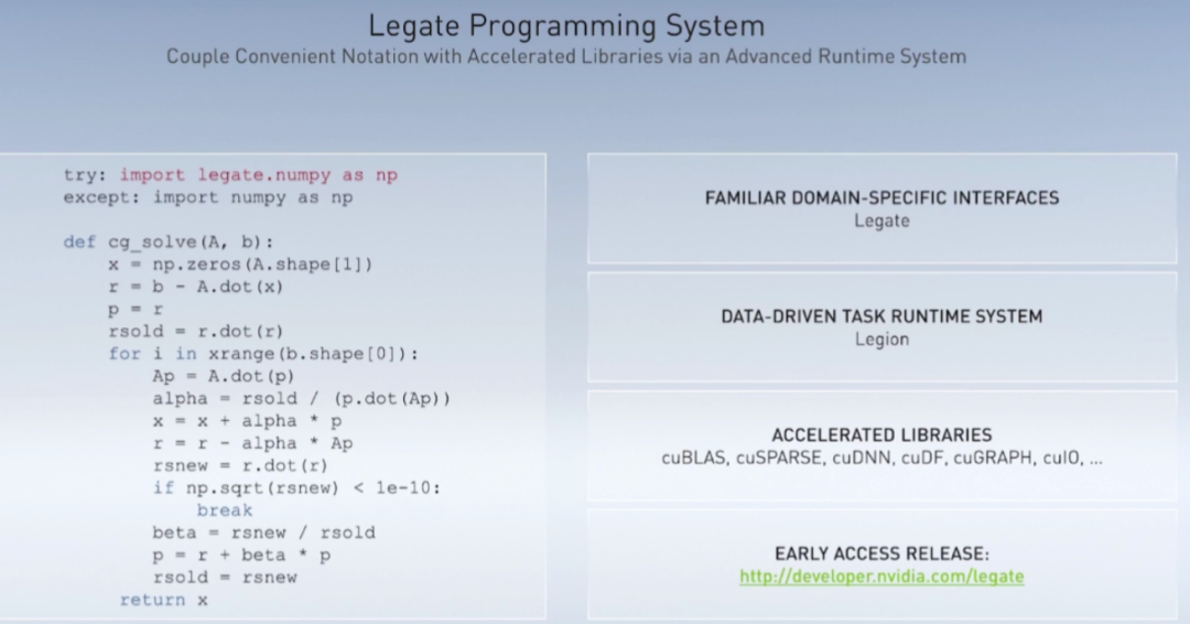 最后,Dally 还介绍了Legate,无需修改代码即可让Python程序无感运行在Jetson Nano上面,所需要做的就是将原本的import numpy as np 改为 import legate.numpy as np