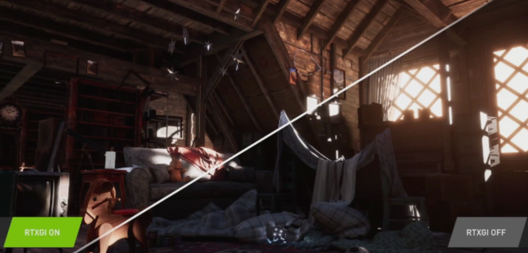 传统图形在直接照明下的显示,灯光在相邻表面上投射光线不会投射出阴影,但通过RTXDI技术,每个光源都会将其光线投射到相邻表面上。