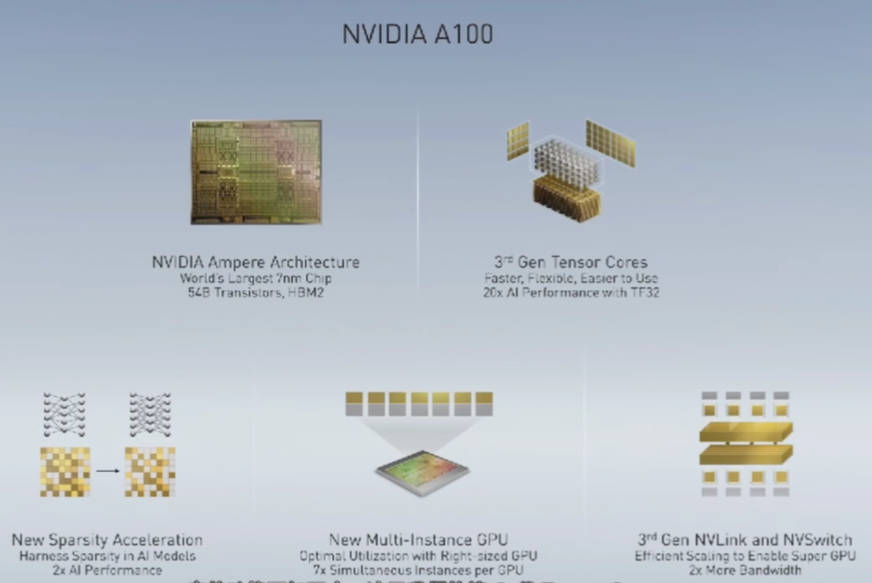NVIDIA A100,不仅是世界最大的7nm芯片,具有540亿个晶体管,相比上一代有了很多的创新。