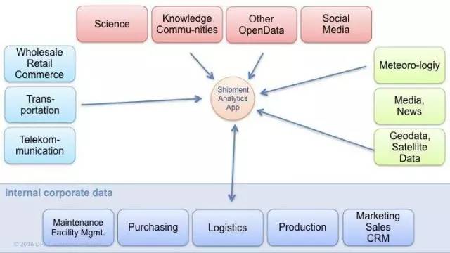 从这边我们可以看到,有一些比较特殊的一些数据,这些数据你只能和大公司合作才能获得,比如你在阿里、京东工作,或者是大型的物流企业,电信企业的话。但是右手边的数据就便宜的多,比如像气象学数据、媒体新闻数据、地理数据和卫星数据等,这些都非常容易获得。但是图最上方的是科学知识、知识社区(包括维基百科)、其他开放数据等,蓝色方框中的是企业内部的数据。如果将不同来源的数据整合在一起,就会带来巨大的价值。