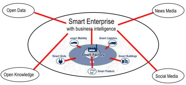 另外我们还有智能移动、智能物流、智能电网、智能建筑,所有这些结合在一起形成一个空间。实际上商业分析就是要收集智能工厂里的数据。现在对商业分析最为重要的是把企业内部和外部的数据结合起来。但是却被大多数人忽视,因为现在人们主要关注的是怎么样把企业本身进行数字化,以及怎么把生产、规划、物流等企业运作流程数字化,利用算法来和数据流进行管理。