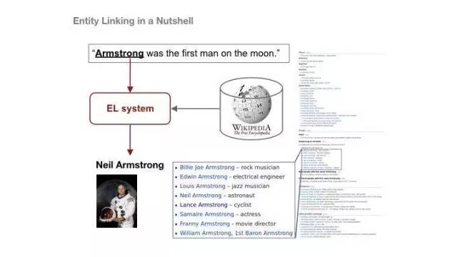 我们将工具挖掘(mean crawling)外包给了一家公司,我们对语义工具进行过滤,然后再进行预处理、实体发掘和联系以及事件提取,最后得出可以用在多个项目中的KPI。接下来我们再谈谈实体联系,这项工作极具挑战性,这个系统是我们几年前构建的,并在2015年的时候获得一个奖,我们这几年一直在做改善该系统,效果也不错。比如说阿姆斯特朗这个名字,它可能是指摇滚乐手、宇航员等,我们将内部知识和外部知识联系起来,识别出来谁是你想查的那个人。微机百科也要使用,有的企业数据结构化,对于这样的信息我们也会整体在实体联系的结果当中。