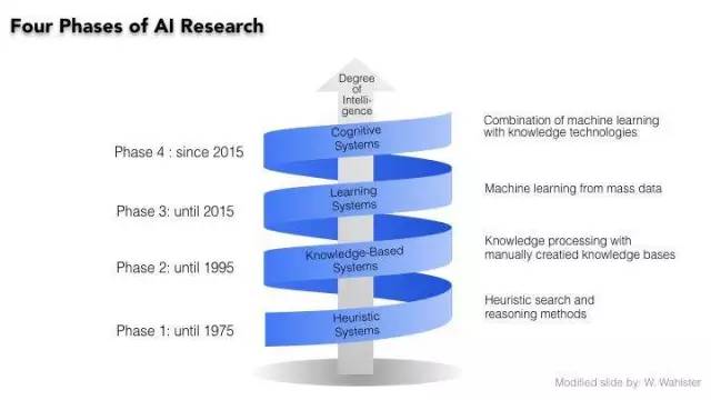 上图是DFKI的CEO做的图,我前面有讲过工业4.0就是他的想法,他同时也是一名人工智能研究人员。到1975年的时候,我们现在主要的是一些搜索、启发式的搜索和认知的一种方法,到1995年是基于知识的系统,人们试图研究知识工程学并构建海量的知识,这非常困难,而且当时没有足够多的知识可以建立。