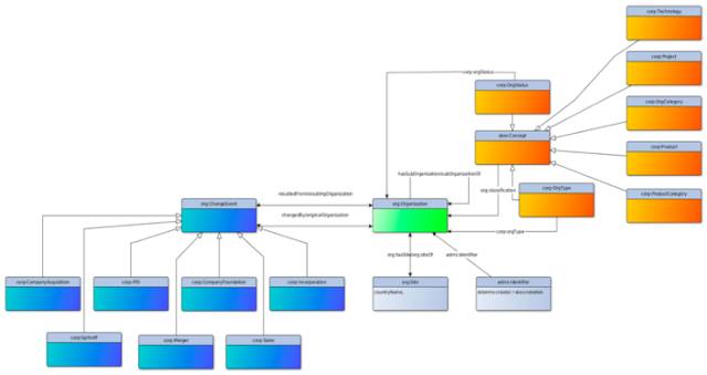 这个图就不赘述了。这是一个企业内部语义网,它定义了企业之间,企业与产品之间,产品和科技,科技和科技,企业内部人与人之间关系。最后就会得到一张这样的知识图谱,现在应用在供应链关系和市场调研中。