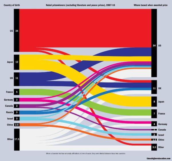 俄罗斯虽然堪称诺奖摇篮,但却留不住这些诺奖人才,网上有一张图记录了2007到2016年十年间,各国诺贝尔奖得主(排除文学奖与和平奖)的出生地到获奖国籍的变化。