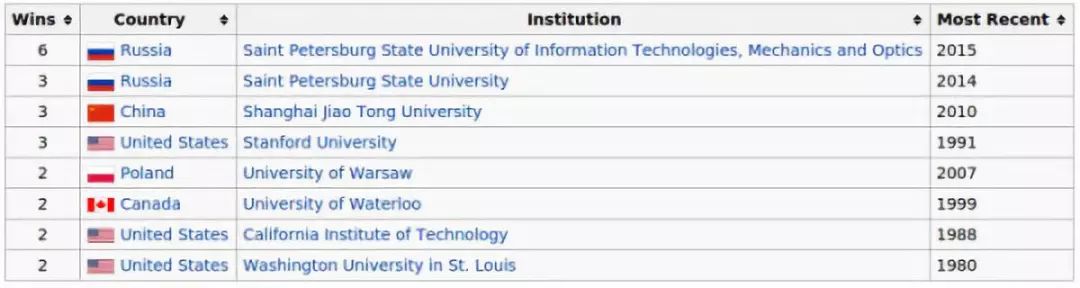 以上是ACM竞赛冠军次数最多的大学,第一名是俄罗斯的圣彼得堡国立信息技术机械与光学大学,简称 圣光机大学(ITMO),该校多年来一直压制着美国的斯坦福大学和加州理工大学。