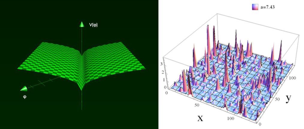 最近,我们研究了一类具有尖角势函数的暴胀模型。这样一类尖角势函数可以在超弦理论中的一些非微扰效应中出现。他们发现该模型产生的原初密度扰动和原初引力波与目前的宇宙微波背景辐射观测数据一致,在暴胀结束的宇宙重加热阶段能够产生具有双峰结构的随机引力波能谱【4】。该能谱与一般的暴胀场产生的单峰能谱显著不同;该预言能够被将来的LIGO实验所检验。暴胀结束后暴胀场在尖角势函数的极小值点附近震荡,由于势函数的二阶导数是狄拉克函数,暴胀场的能谱在动量空间一些区域随时间剧烈增长,产生大量的能量聚集的震荡子结构,暴胀场自身变得极不均匀。这种空间不均匀的结构导致了很强的随机引力波背景的产生。