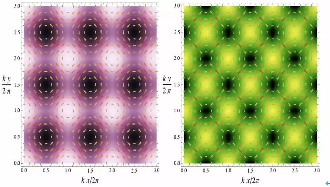 左图和右图分别给出了从全息模型得到的棋盘格状的超导凝聚和电荷密度的空间调制,其中箭头代表自发流密度的分布。