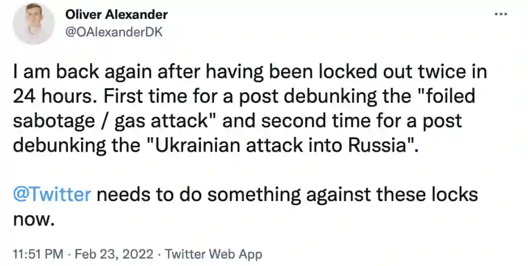 推特将这一事件归咎于一个管制错误。相关人士称,如果乌克兰部分地区断网同时此类封号变得普遍,人权受侵犯的风险就会增加。