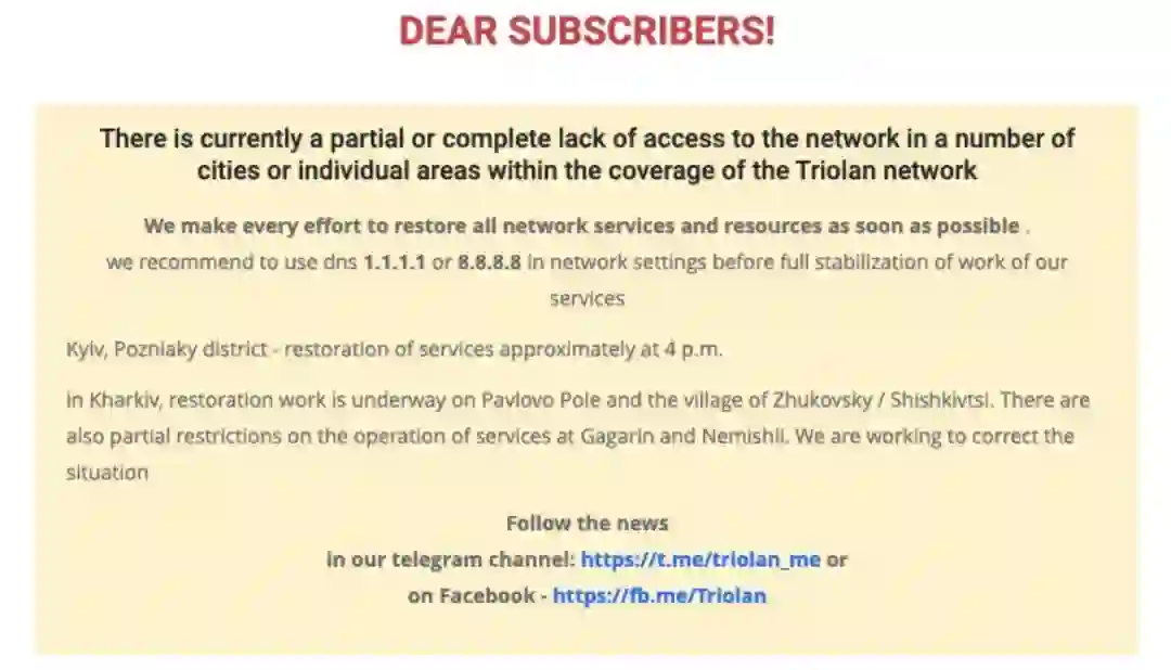 中断正在影响Triolan互联网服务提供商,该公司服务于包括哈尔科夫在内的许多城市和其他地区。