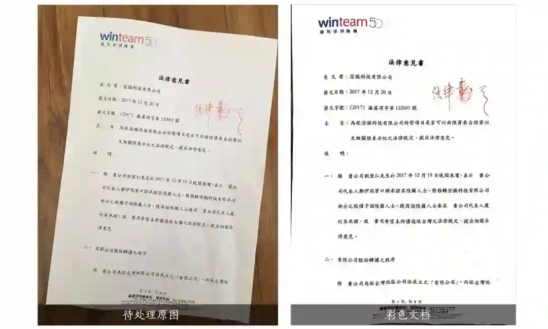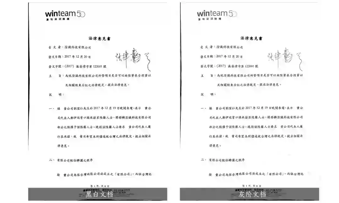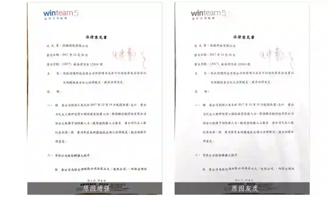 其中,彩色文档、黑白文档、灰阶文档,是强化内容,弱化背景,基本全部将底色扣掉的处理方式,灰阶文档的字体比黑白文档的字体又细一些,灰度淡一些。而原图增强和原图灰度,是在原图的基础上进行的简单色彩处理,不会滤掉底色。
