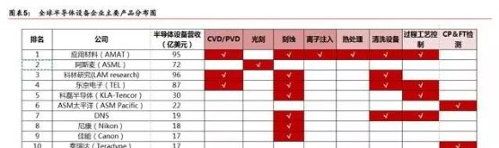 据Bloomberg数据,2017年全球五大半导体设备制造商分别为应用材料(AMAT)、阿斯麦(ASML)、拉姆研究(LamResearch)、东晶电子(TLE)、科磊(KLA),这五大半导体制造商在2017年以其领先的技术、强大的资金支持占据着全球半导体设备制造业超过70%的份额。