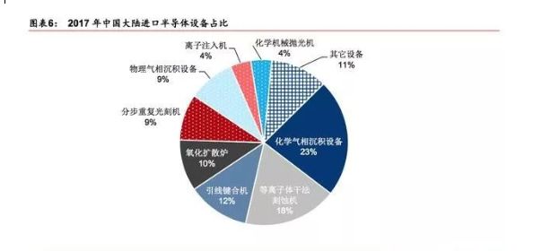 据SEMI统计,2017年中国大陆半导体设备销售额为82.3亿美元,据中国电子专用设备工业协会数据,2017年中国国产半导体设备(不含光伏设备)48.07亿元,据此计算中国半导体设备市场国产化率仅为9%。