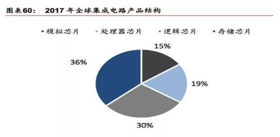 进一步细分,集成电路包括逻辑芯片、存储芯片、处理器芯片和模拟芯片四种。根据WSTS的数据,2017年逻辑芯片、存储芯片、处理器芯片和模拟芯片市场规模分别为1022亿美元、1240亿美元、639亿美元和530亿美元,在整个集成电路市场的比例为30%、36%、19%、15%。