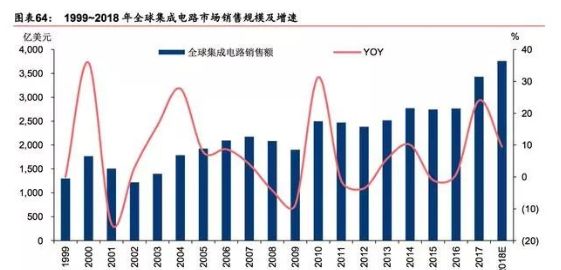 据WSTS预测,2018年全球半导体市场规模有望增长至4,512亿美元/yoy+9.5%,市场景气度有望延续,再创历史新高。