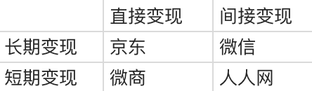 “直接变现”和“间接变现”差别呢,可以用京东和微信的例子来简单的感受一下:京东诞生,就是做线上零售的,人们比较自然的愿意为了这个日常需求直接买单;而人们显然并不愿意(或者不习惯)为了微信的主要功能“聊天”而付费,所以微信的变现手段都是衍生出的间接的,比如微信钱包、理财、朋友圈广告等等。