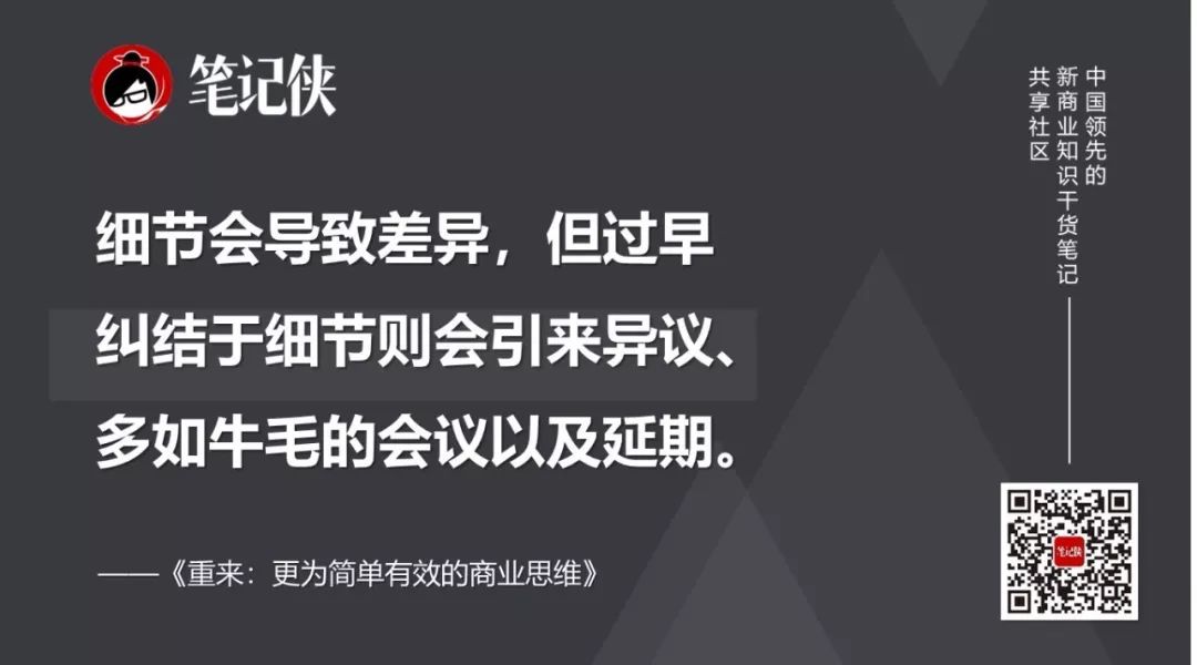 细节会导致差异,但过早纠结于细节则会引来异议、多如牛毛的会议以及延期。你会迷失在不重要的环节中,浪费时间去做一些迟早要变的决定。