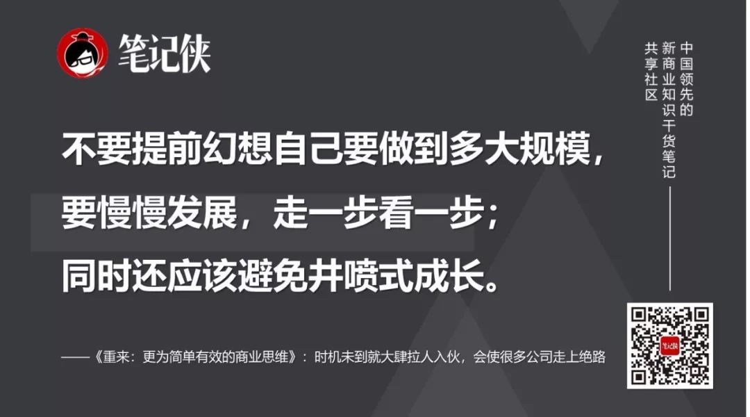 不要提前幻想自己要做到多大规模,要慢慢发展,走一步看一步——时机未到就大肆拉人入伙的做法使很多公司走上了绝路。