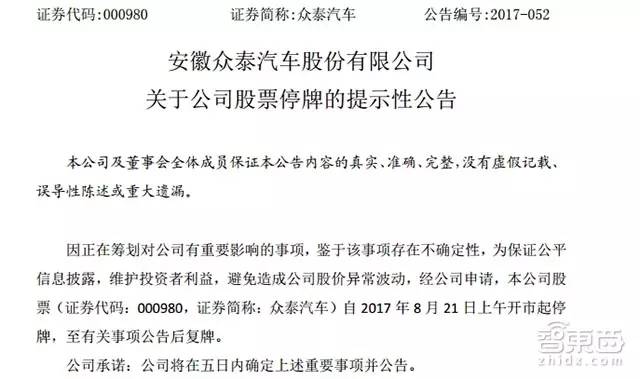 8月18日,众泰汽车发布公告称“因正在筹划重大事项”,公司将自2017年上午起停牌至具体事项公布后复牌。