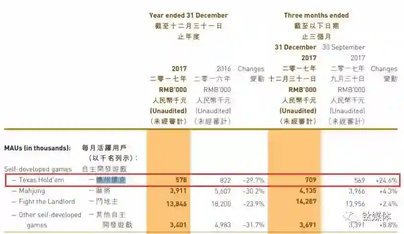 2016年开始,联众国际不再于财报中披露PC端德州扑克的收入情况,只公布用户每月活跃用户数(MAU),2015年至2017年,在联众平台上玩德州扑克的活跃玩家从58.6万一度增至82.2万,却又在去年掉回了57.8万。