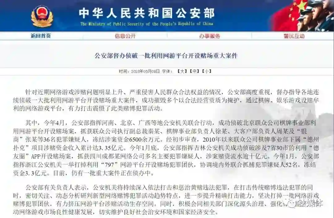 据公安部日前通报,今年4月,公安部指挥河南、北京、广西等地公安机关联合行动,成功侦破北京联众公司棋牌事业部利用网游平台开设赌场案,抓获联众公司执行副总裁秦某、棋牌事业部负责人徐某、大客户部负责人周某及“银商”张某等36名犯罪嫌疑人,冻结涉案资金6500余万元。