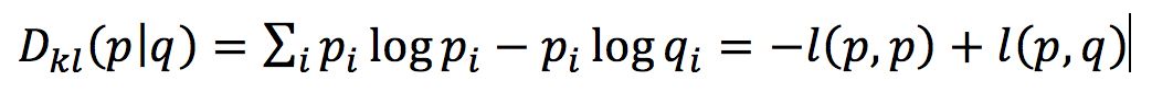 其中l(p,p)是分布p的熵,而l(p,q)就是p和q的交叉熵。假如p是一个已知的分布,则熵是一个常数,此时dkl(p|q)与l(p,q)也就是交叉熵只有一个常数的差异,两者是等价的。