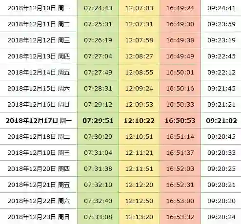 北京近期日出、正午、日落时间和昼长。可见虽然12月22日那天昼长最短,但却不是日出最晚、日落最早的那天