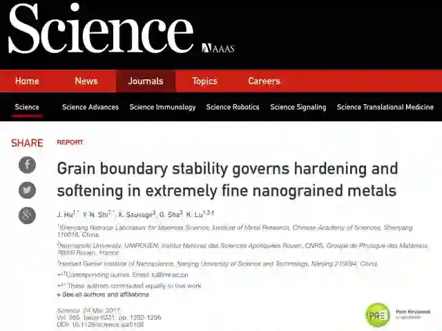 就在今年的3月24日,Science在线发表了卢柯的一项全新研究成果。研究发现通过适当合金元素的晶界偏聚可以提高晶界稳定性,从而可以大幅度调控纳米金属的强度。这一发现揭示了纳米材料中软化和硬化行为本质,澄清了过去三十多年来关于这一问题的争论。