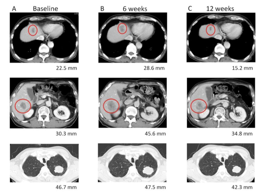 *纳武利尤单抗治疗6周后评价:肝脏病灶增大,血清CEA降低。