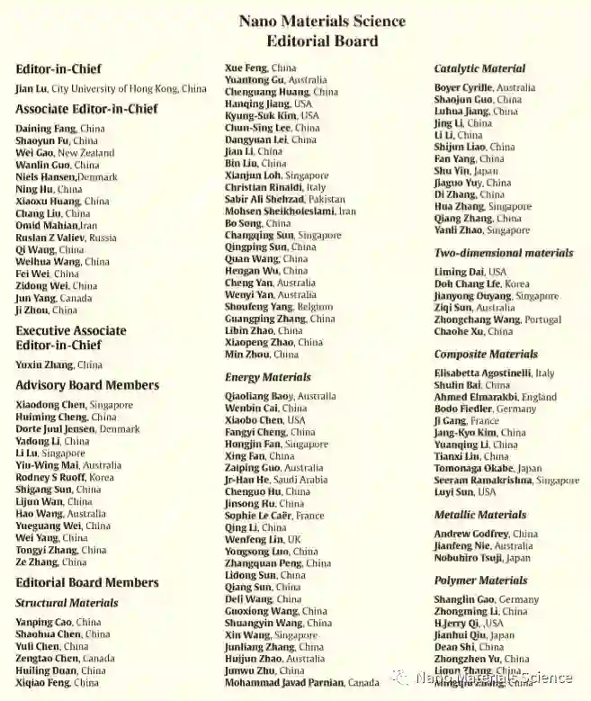 NMS聘请了来自中国、美国、英国、加拿大、新加坡、日本、俄罗斯、丹麦、澳大利亚、法国、德国等19个国家129名顶尖学者组建编委团队,其中包括16位院士:结构材料领域专家吕坚院士、方岱宁院士、郭万林院士、张统一院士、魏悦广院士,纳米力学专家杨卫院士,纳米表面技术领域专家高唯院士,金属材料领域专家Ruslan Z Valiev院士、Niels Hansen院士、Dorte Juul Jensen院士,结构复合材料领域专家Yiu-Wing Mai院士,高分子材料领域专家王琪院士,无机非金属领域专家周济院士,碳纳米材料专家成会明院士,石墨烯领域专家Rodney S Ruoff教授,材料科学晶体结构专家张泽院士等。