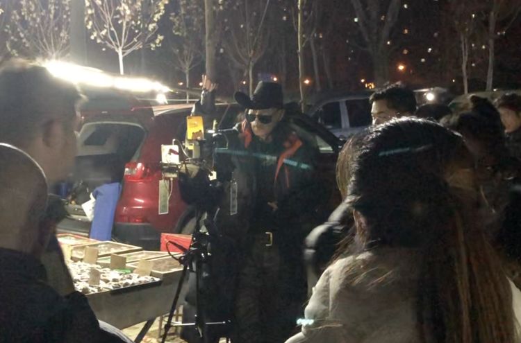 这位晚上戴着墨镜,头顶牛仔帽,架着三台手机的时髦主播,倒是给这一晚寒夜增添了些许暖意。