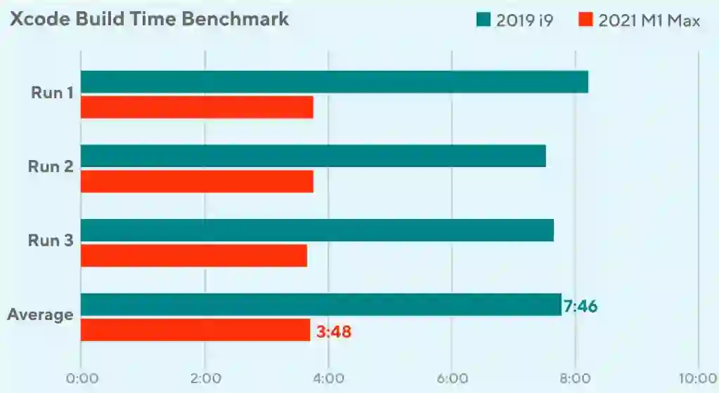图2:2019年英特尔i9 MacBook Pro和2021年M1 Max MacBook Pro上对我们的基准项目进行多次 "清理 "构建的时间比较