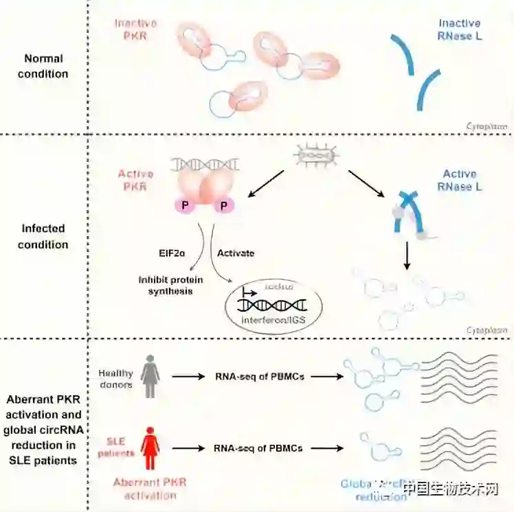 研究组的前期研究证明,环形RNA生成速度缓慢,这类具有闭合环状结构的非编码RNA分子内部并不简单,倾向于形成16~26个碱基对茎环结构。它们独特的“造型”能够被天然免疫因子PKR识别并结合,因此,PKR活性受到抑制,可以避免体内因PKR过度激活引起的免疫反应。当病毒入侵细胞后,环形RNA会被核糖核酸酶RNase L大规模“切割”降解,而缓慢的环形RNA生成速度不足以回补这些被降解的环形RNA,PKR得以释放而进一步激活,引发一系列抗病毒的“连锁反应”。