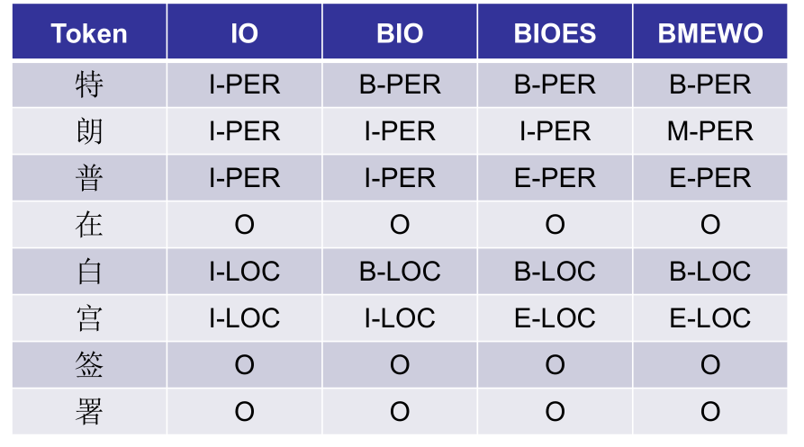 那么在一些已经标注的数据中,如何来标注实体呢,例如上图中的时间。目前有几种标注体系,包括IO、BIO、BIOES、BMEWO,在不同的标注体系中,有不同的意义。目前比较常用的两种标注体系是 BIO 和 BIOES。如下图的标注案例。