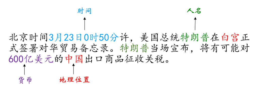 实体识别(NER)的目的是抽取文本中的原子信息,包括人名、组织机构名、位置、时间、金钱等。下面是例子。
