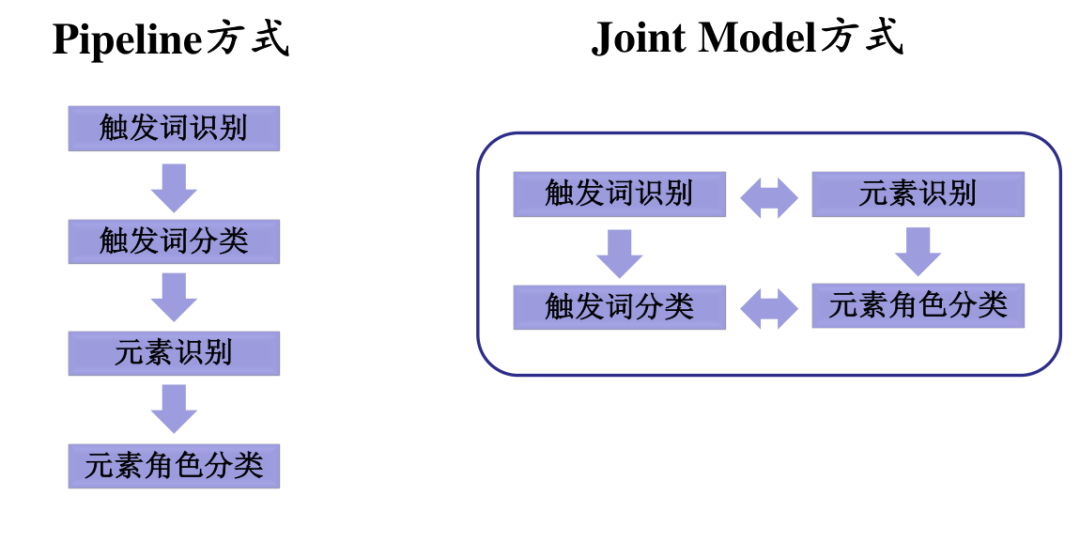最主要的还是目前的深度学习方法,这里和关系抽取类似,又分为Pipline和Joint Model的方法。如下图。