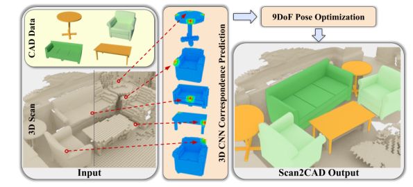 本文提出了Scan2CAD1,这是一种新颖的数据驱动方法,它学习如何将形状数据库中的纯3D CAD模型与RGBD扫描的噪声和不完整几何形状对齐。对于室内场景的3D重建,我们的方法将一组CAD模型作为输入,并预测将每个模型与基础扫描几何对齐的9DoF姿势。为了解决这个问题,我们基于1506 ScanNet扫描创建了一个新的scanto-CAD对齐数据集,其中包含来自ShapeNet的14225个CAD模型与扫描中的对应对象之间的97607个带注释的关键点对。我们的方法在3D扫描中选择一组代表性关键点,寻找它们与CAD几何体的对应关系。为此,我们设计了一种新颖的3D CNN架构,以学习真实物体和合成物体之间的联合嵌入,从而预测对应的热度图。基于这些对应热度图,我们制定了变分能量最小化,使一组给定的CAD模型与重建的结果对齐。我们在新推出的Scan2CAD基准测试中评估了我们的方法,它比手工特征描述以及最先进的CNN方法都优秀21.39%。