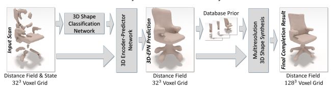 本文提出了一种数据驱动方法,通过体积深度神经网络和3D形状合成的组合来补全部分3D形状。从部分扫描的输入形状,我们的方法首先推断出分辨率低、但完整的输出。为此,我们提出了由3D卷积层组成的3D-Encoder-Predictor(3D-EPN)网络。训练网络以预测和填充丢失的数据,并对隐含的表面表示进行操作,该表示对已知和未知空间进行编码。这使我们能够以高精度预测未知区域的整体结构。然后,我们在测试时将这些中间结果与形状数据库中的3D几何形状相关联。在最后一遍中,我们提出了一种基于补丁的3D形状合成方法,该方法将来自这些检索到的形状的3D几何形状强加为粗略完成的网格上的约束。该合成过程使我们能够在遵循由3D-EPN获得的全局网格结构的同时,重建比例细节并生成高分辨率输出。虽然我们的3D-EPN优于最先进的补全方法,但主要贡献在于数据驱动的形状预测和分析3D形状合成的结合。在我们的结果中,我们展示了对新引入的真实和合成数据的形状补全基准的广泛评估。
