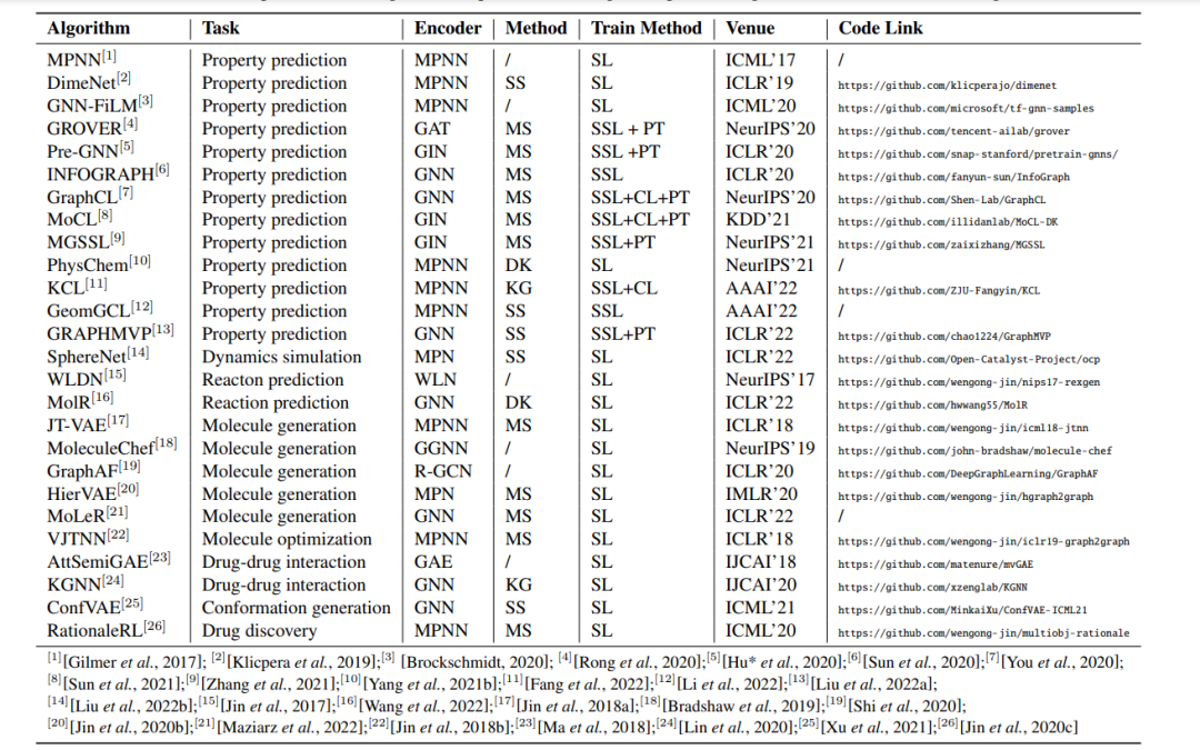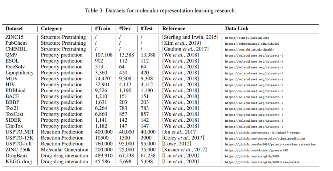我们在表2中总结了代表性的分子表示学习算法。为方便查阅实证结果,每篇论文均附有代码链接(如有)。文中还列出了相应的任务、编码算法、方法和训练方法。这里,方法指定了我们在第3节中讨论的4种方法。对于训练方法,我们包括自我监督学习、监督学习、训练前学习和对比学习。除了算法,我们还在表3中总结了不同化学任务常用的数据集。