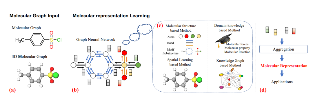 基于图的分子表示学习综述: (a) 两个分子图; (b) 图神经网络的一般学习过程; (c) 提出了四种基于图的分子表示学习方法; (d) 聚合原子表示以获得分子表示的过程。