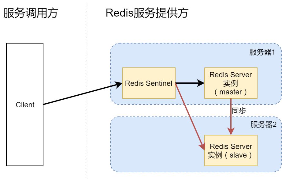 一般情况下,我们搭的个人网站,或者平时做开发时,会起一个单实例的Redis Server。调用方直接连接Redis服务即可,甚至Client和Redis本身就处于同一台服务器上。这种搭配仅适合个人学习娱乐,毕竟这种配置总会有单点故障的问题无法解决。一旦Redis服务进程挂了,或者服务器1停机了,那么服务就不可用了。并且如果没有配置Redis数据持久化的话,Redis内部已经存储的数据也会丢失。