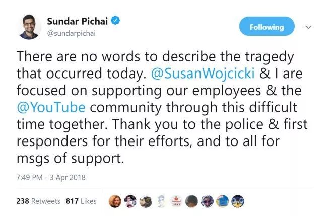 作为 Youtube 的母公司,谷歌首席执行官 Sundai Pichai 在事件发生后第一时间发布声明,称将尽一切努力协助受害者。